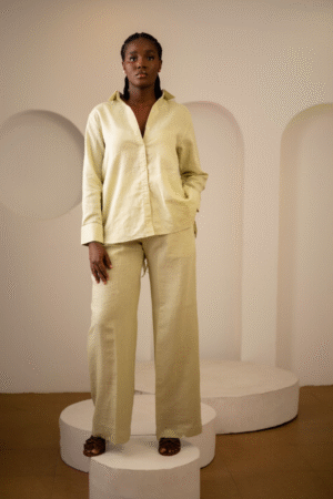 The shirt’s easy fit and crisp structure make it perfect for both casual and dressed-up days, while the trousers offer a relaxed yet flattering silhouette that moves with ease. Together, they create a versatile look that works for brunches, creative workdays, or slow weekends in the city.